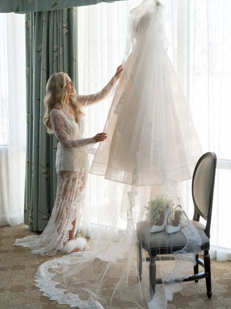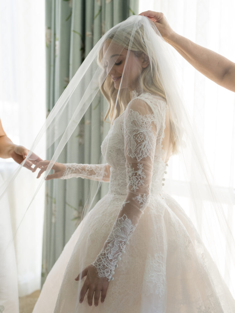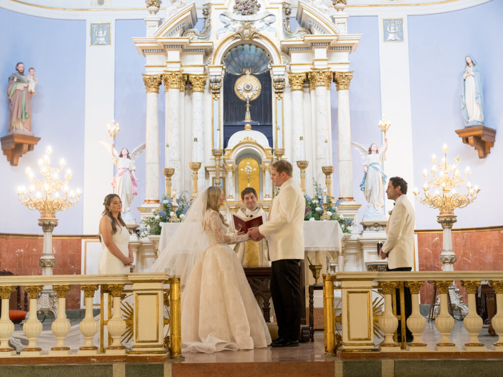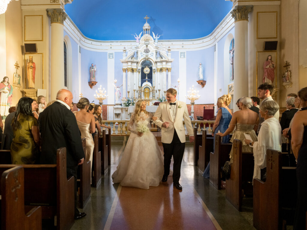 This chic bride dreamed of a classic New Orleans wedding, with a ceremony at her grandfather’s church, St. Mary’s. That all came true when she married her highschool sweetheart Tyler. Morgan wore a timeless Monique Lhuillier gown from I Do Bridal Couture, featuring a clean silhouette with delicate lace details and a flowing train..